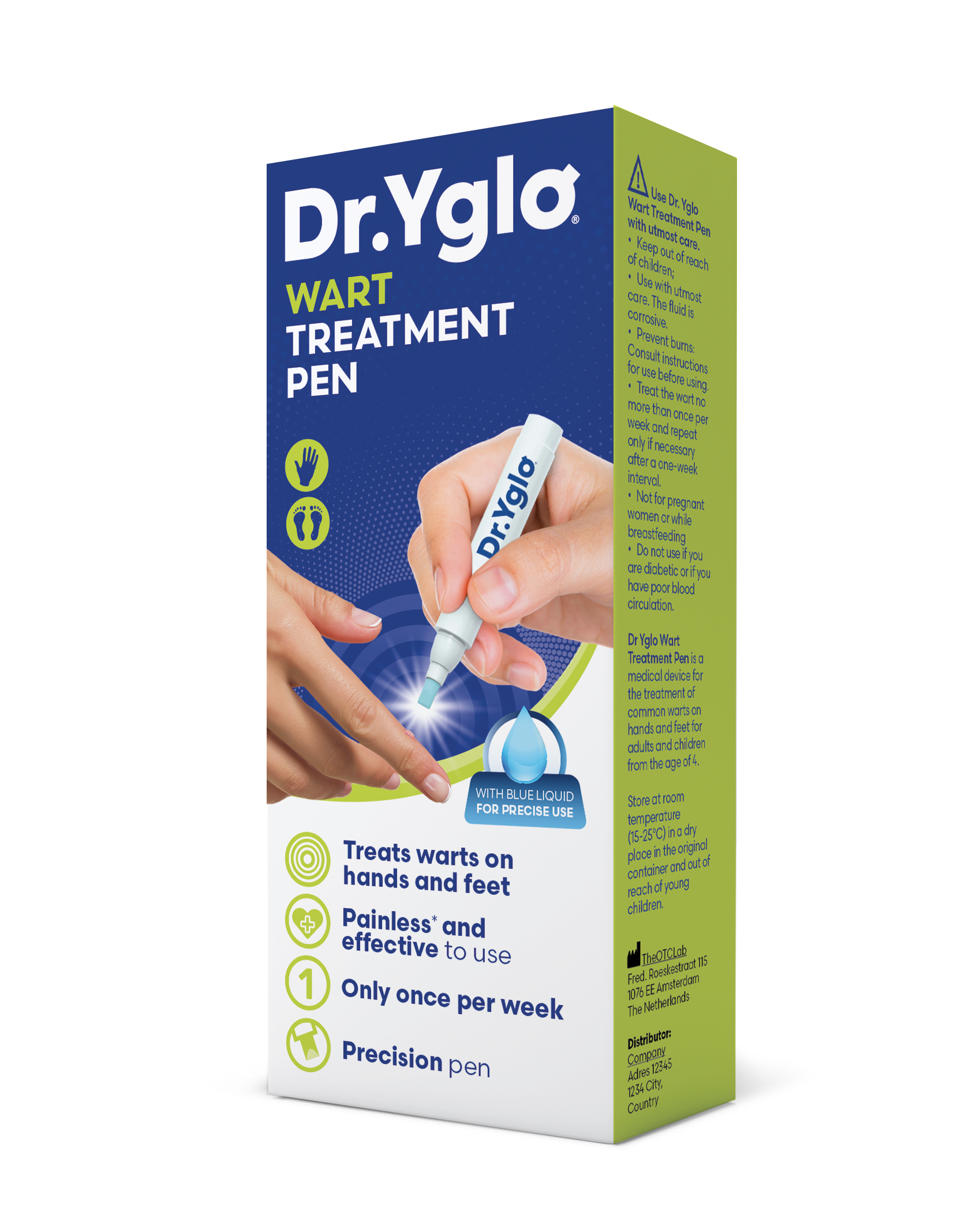 Dr. Yglo Wart Treatment Pen is an easy-to-use treatment for common warts on hands and feet for adults and children from the age of 4. The precision pen has a blue liquid for precision marking.
